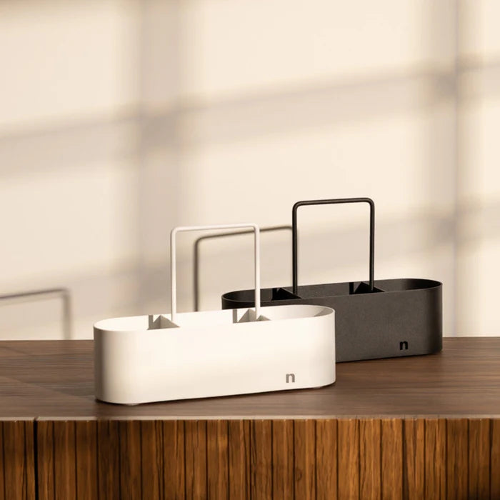 you use this designer piece as a sink organizer, the drain channel ensures that the water from your wet sponges can drain away at any time. The practical carrying handle can be converted into a holder for dishcloths. The padding on the underside of the organizer prevents scratches on delicate surfaces. Our timeless interior colors of black and white, the engraved nordesign logo, and the powder coating give the sink organizer a high-quality look and feel.