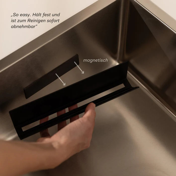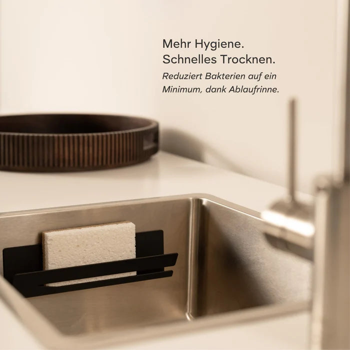 Discover our chic and minimalist holder with a rust-proof guarantee. This designer holder is the perfect storage solution for dish sponges and cleaning cloths. It saves space, improves hygiene (sponges dry quickly), and adds a stylish accent to your kitchen. Plus, your sink will always look tidy. Unlike comparable products, the holder is not made in Asia, but by hand in Europe.