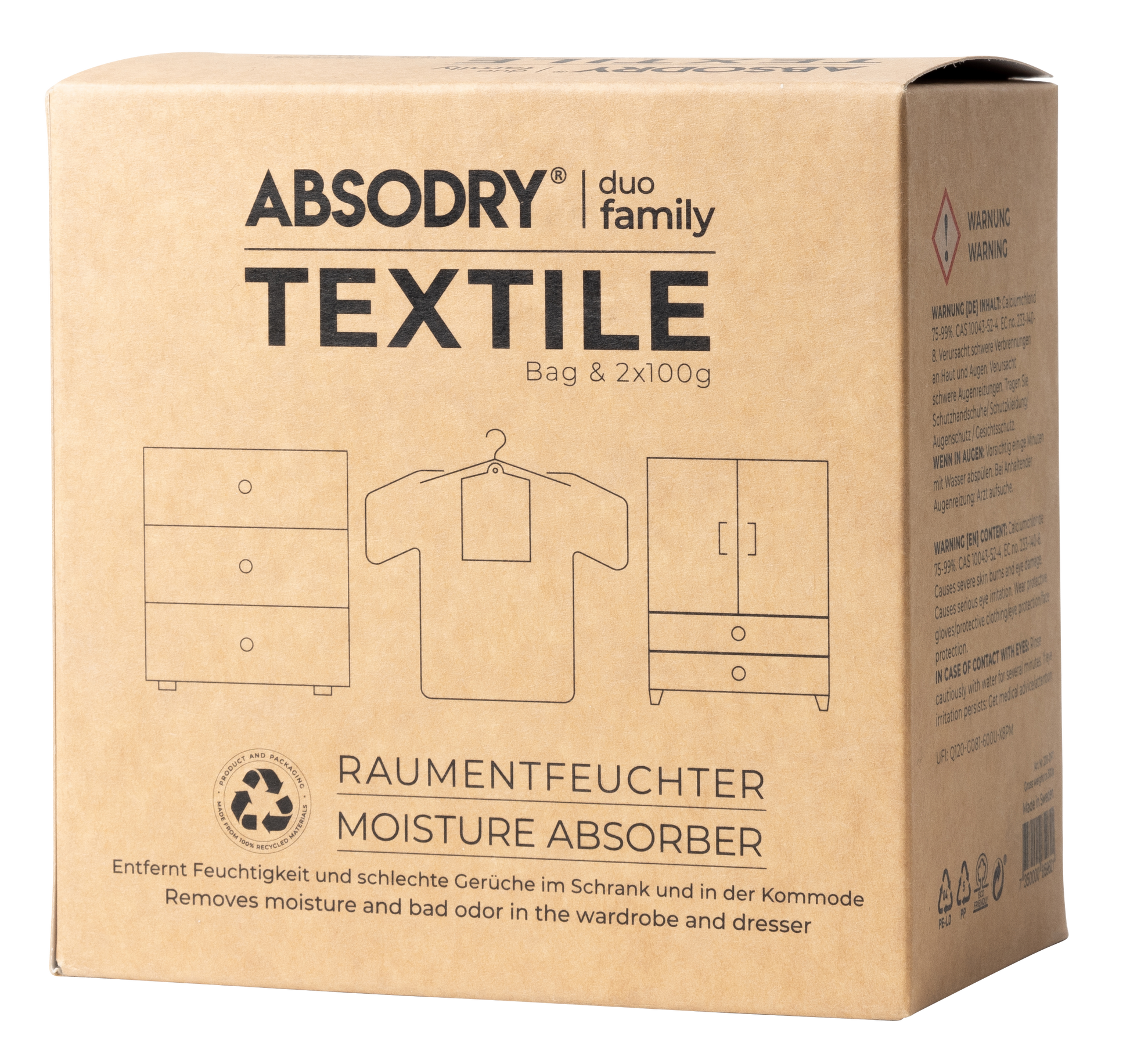 Το Absodry Duo Family Textile είναι ο απορροφητής υγρασίας για την ντουλάπα, το συρτάρι ή το ράφι των καπέλων. Παρέχεται με 2 σακουλάκια αναγόμωσης των 100 γραμμαρίων το καθένα, εντελώς σφραγισμένα και χωρίς διαρροές. Ένα σακουλάκι αναγόμωσης διαρκεί 1-3 μήνες ανάλογα με την υγρασία όπου τοποθετείται. Μπορείτε να τοποθετήσετε ένα ή δύο σακουλάκια αναγόμωσης στην συμπεριλαμβανόμενη μαύρη τσάντα.