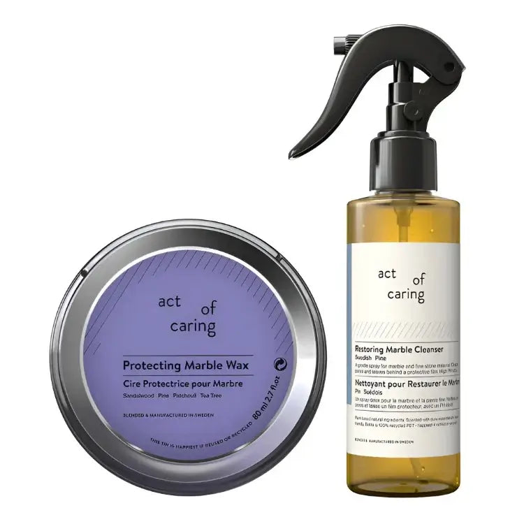 Το πλήρες κιτ της Act of Caring για τη φροντίδα των μαρμάρινων ή εκλεκτών πέτρινων αντικειμένων σας. Καθημερινός καθαρισμός του αντικειμένου και φροντίδα δύο φορές την εβδομάδα για παράταση της διάρκειας ζωής του υλικού.