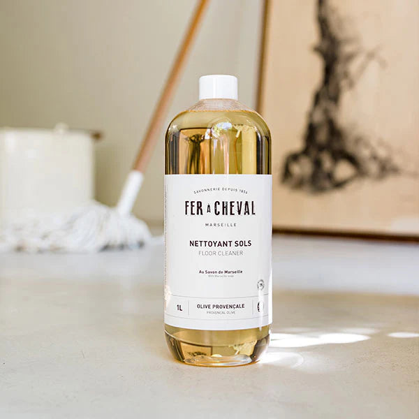 Το καθαριστικό δαπέδου Fer à Cheval καθαρίζει και απολιπαίνει όλα τα πλενόμενα εσωτερικά και εξωτερικά δάπεδα, χωρίς να αφήνει υπολείμματα. Βασισμένο στο Savon de Marseille που μαγειρεύεται σε καζάνι, γνωστό για τις καθαριστικές και απολιπαντικές του ιδιότητες, η φόρμουλά του περιέχει 99% φυσικά συστατικά, χωρίς συντηρητικά ή χρωστικές.