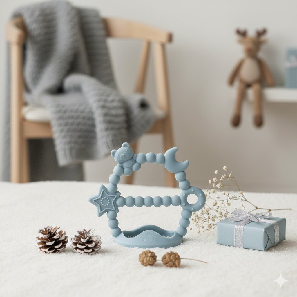 - Επιφάνεια πολλαπλών υφών — μαλάσσει απαλά τα ούλα και υποστηρίζει την αισθητηριακή ανάπτυξη